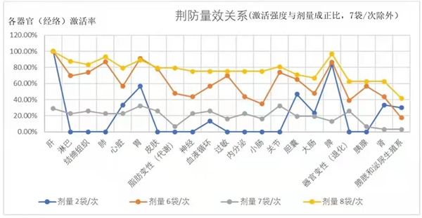 但是每次6袋的数据没有每次8袋(黄色曲线)的数据高,每次8袋各经络(器官)的激活率都很高。从强度上讲,每次8袋是最平均的,基本上都在激活的最高值。为什么每次8袋最好?或者说为什么是每次8袋?