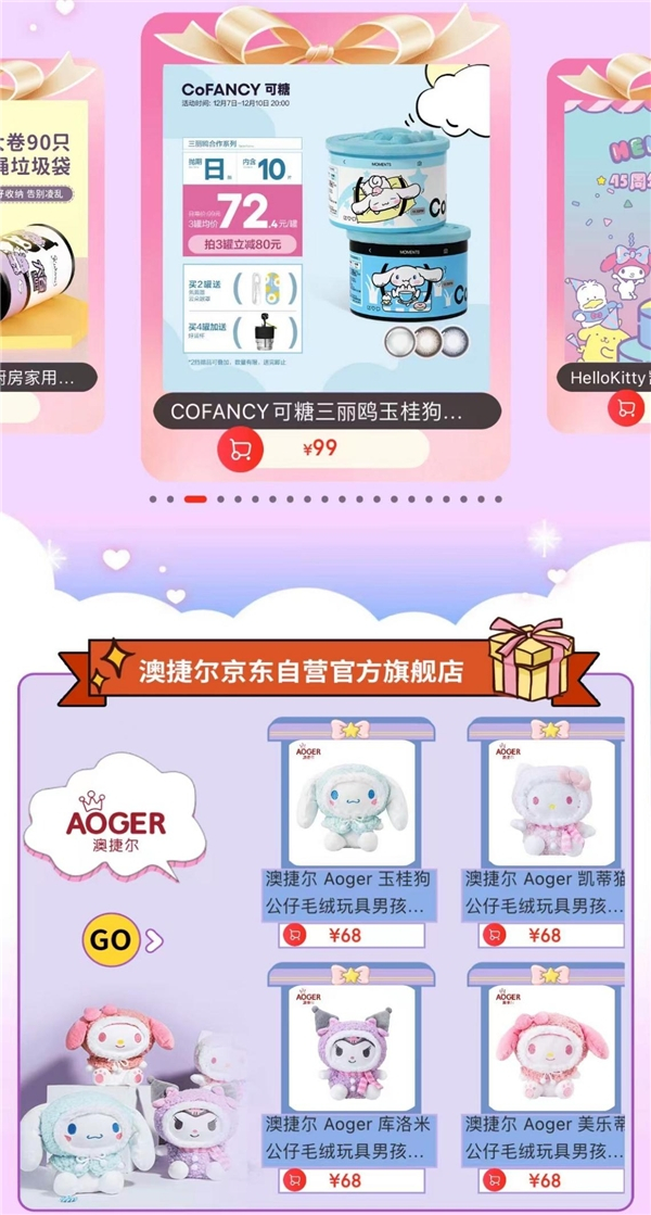随着以90后、00后为首的Z世代消费者逐渐成为消费主力军,年轻消费群体的消费偏好开始成为重要考量因素。“IP联名”无疑天然契合年轻消费者在满足物质层面的需求的同时,更提升在文化和精神层面的满足感。其中,三丽鸥家族更是受到了众多新世代消费者的青睐。京东三丽鸥礼物特别季将以优秀的产品力为承载基础,将内容创意、设计创意、产品创意和用户体验进行深度绑定,以深刻洞察各种年轻人兴趣、情绪和情感需求为切入点,持续满足年轻人的潮玩消费需求。
