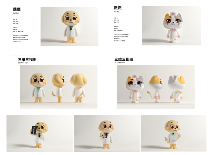 如果说以温柔治愈的金毛和俏皮阳光的猫咪为原型,代表着瑞派的文化底色,那么“瑞瑞”这样认真严谨的优秀宠物医生和“派派”这样俏皮亲和的可爱护士就是瑞派无数医护人员的缩影,切换不同的工作场景,百变造型展现瑞派医护捍卫陪伴的决心。