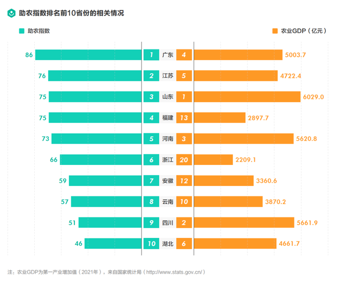 助农指数排名前10的省份为广东、江苏、山东、福建、河南、浙江、安徽、云南、四川和湖北。除福建、浙江和安徽的农业GDP排名分别位居第13、20和12外,其余7个省份农业GDP排名均位居前10。