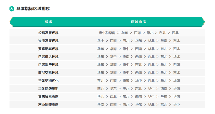 华东地区在多数指标中位居首位,包括要素配套环境、内容供给环境、内容消费环境和商品交易环境。西北地区的主体活跃周期、华北地区的零售贸易贡献、东北地区的主体结构优化均在7大区域中位居首位。