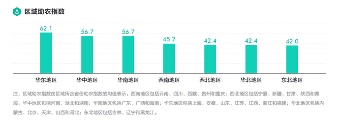 如果对区域助农指数进行排序,结果为:华东>华中和华南>西南>西北和华北>东北。2020年华东地区县域农产品网络销售额达1481.7亿元,占全国县域农产品网络销售额的比重为42.2%,在所有区域中排名第一。
