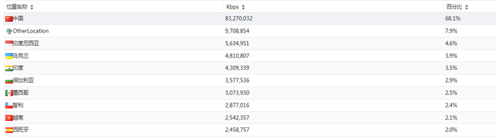 本次攻击中国境内流量占比高达68.1%,海外流量合计占比31.9%。流量占比TOP10国家和地区如下: