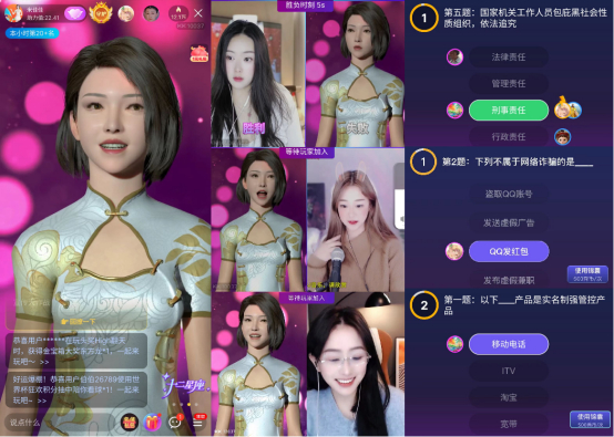 活动现场,数字人米佳佳在线担当“普法宣传小能手”,连线平台主播进行“普法300问”,带领近10万观众一路过关斩将,在百问百答间让主播与观众在把法律知识牢记于心。