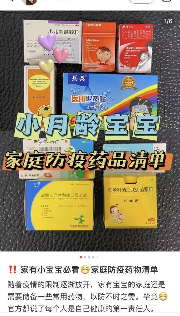 在一些颇具人气的社交平台上,博主们纷纷分享了囤药清单并晒出了自己购置的防疫包,比如退烧药布洛芬、消炎药物阿莫西林以及藿香正气胶囊等,甚至还有口罩、消毒水。其中,儿童抗感类的药品和用品,更是成为家长必囤之物,譬如美林、兵兵退热贴、小儿止咳糖浆等,均被家长收入了囤药清单。