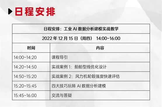 2022年12月15日,本年度最后一场公开培训“工业AI数据分析建模实战教学”即将上线,下面一张图带你一探究竟。