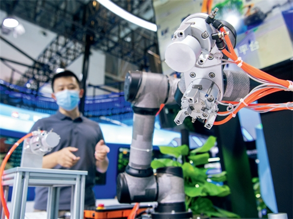 2022中国国际智能产业博览会上,工作人员在介绍应用于智能加工场景的柔性上下料平台