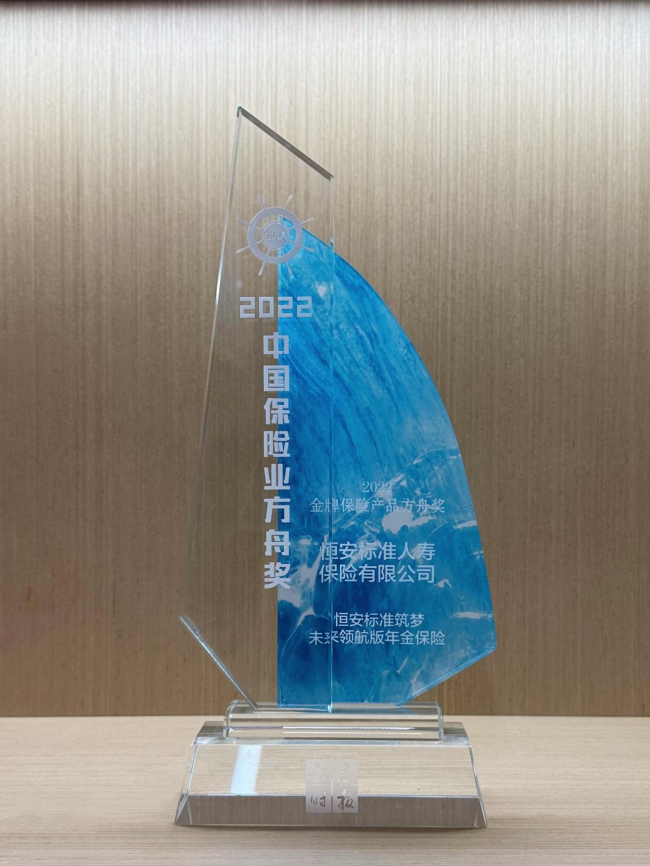 “恒安标准筑梦未来领航版年金保险”荣获“2022金牌保险产品方舟奖”