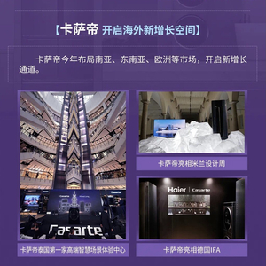 卡萨帝在国内加紧场景化落地步伐的同时,在海外市场的布局也在进一步提速。,今年6月,卡萨帝鉴赏家套系亮相米兰设计周,8月,泰国首家智慧场景体验店在曼谷Central World开业,9月又参展2022年德国IFA展。据了解,卡萨帝今年内还计划在东南亚开拓5家场景体验店。这也意味着,继葡萄牙圣灵庄园、意大利坎顿庄园、英国欣威克庄园等海外高端庄园,海外市场的更多高端家庭也能体验到卡萨帝智慧场景。同时,这一系列动作释放出一个重要信号:卡萨帝正在进一步覆盖全球用户生活,持续探索下一步增长空间。