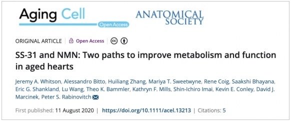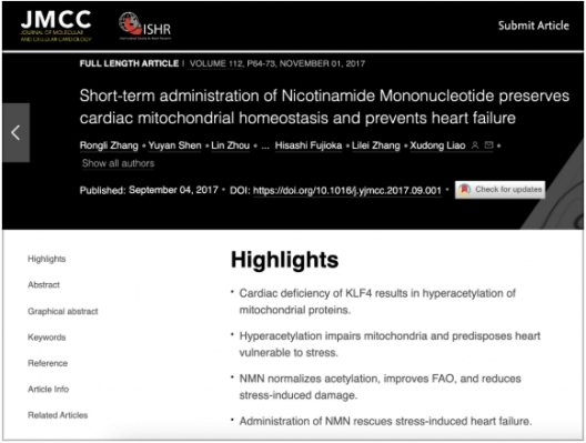 2020年,美国华盛顿大学的研究,测试了两种不同的线粒体靶向药物SS-31(一种合成四肽)和NMN的作用,结果发现SS-31部分逆转了与年龄相关的舒张功能下降,而NMN则完全逆转了与年龄相关的心脏收缩功能缺陷。两者的协同效应能更好地让老化的心脏恢复活力。