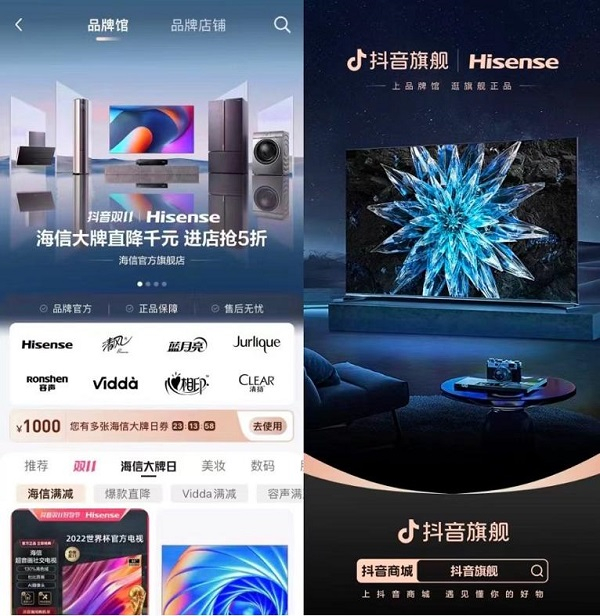 据介绍,今年抖音双11好物节,海信的主要策略与抖音商城的玩法资源对齐,例如除了商城的大额券、跨店满减、会员制等玩法,还首次联合抖音旗舰,合作了品牌馆等IP和活动。
