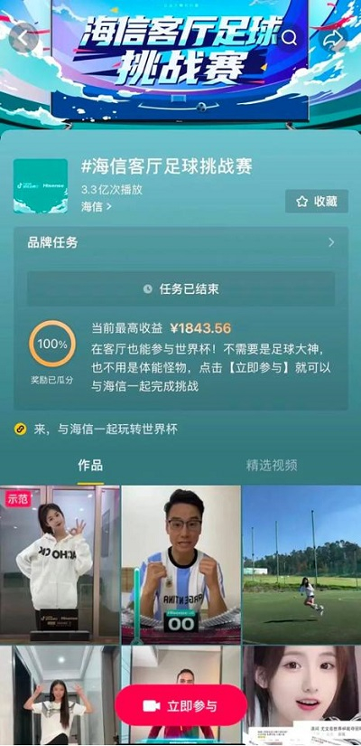 作为世界杯官方赞助商,海信在世界杯期间不仅打造出“Hi足球少年”形象IP,输出大量的前线VLOG 视频,还策划了海信客厅足球挑战赛等活动吸引用户参与互动。