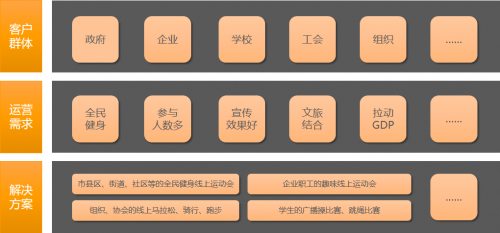 体和友以互联网、大数据、人工智能等新兴技术嵌入传统体育赛事模式,打造出适用于新时代政企、学校、赛事运营商等各行业的全景数字化赛事运营平台。满足客户群体运营需求,提供多场景解决方案。
