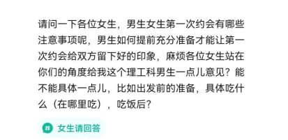 在上海工作的97年男生小欧在村口发布了一条帖子,征集到一些约会时的建议:“如果是初次见面不要直接约饭,建议了解一下女孩子有没有什么兴趣爱好,安排一下双方都能参与的娱乐活动,加深一下了解。”“提前想想聊什么,聊些趣事、生活日常,营造愉快的聊天氛围。着装一定要干净清爽哦!”