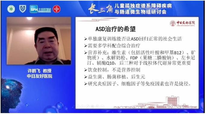 中日友好医院儿科许鹏飞主任在会议中为大家介绍了孤独症谱系障碍的整合医学干预理念,许主任提到,孤独症的影响因素包括遗传和环境共同作用,早期诊断干预对孤独症治疗意义重大。食物过敏对肠道屏障的破坏也是孤独症患儿行为异常的原因之一,早期改变肠道更重要的可能是双歧杆菌。多学科综合治疗是孤独症谱系障碍治疗的希望。