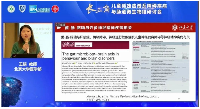 北京大学医学部王娟教授为大家介绍了孤独症儿童肠道菌群的研究进展,王娟教授讲到孤独症谱系障碍会出现部分生理功能异常,往往合并消化道功能失调,通过菌-肠-脑轴影响患儿神经、免疫和代谢,从而影响行为和精神情绪。肠道菌群在孤独症干预中具有重要意义。