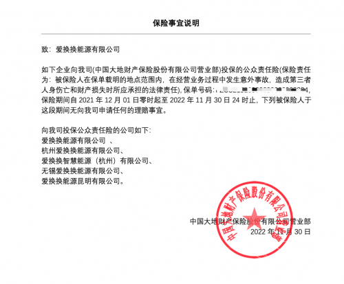 第三,换换的产品质量也受到了保险行业的保障和认可。基于自身高度的社会责任感,换换主动为其运营的换电站购买公众责任险,即如果换换参保的所有换电站和电池发生意外事故,造成第三者人身伤亡和财产损失时,换换将主动承担相关责任,保证用户利益。