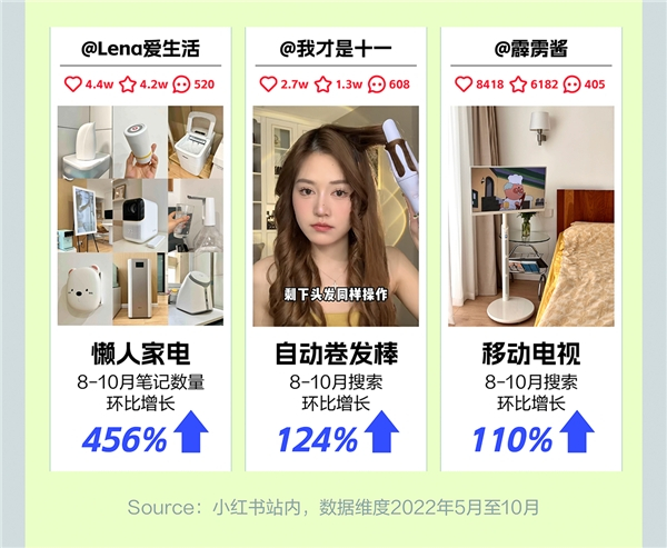 在小红书,没人比年轻人更懂怎么善用家电升级生活日常体验。「懒人家电」相关笔记数高达2w+,8-10月笔记数量环比增长456%。其中,可以自动旋转的自动卷发棒是女生们的变美新宠,走哪拖哪的移动电视以“成年人的iPad”强势出圈......能逛会买的年轻人,把新型家电用成“报恩神器”,为自己的懒提前找好帮手。