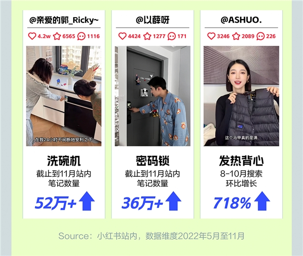 不仅要改善自己,也要幸福爸妈,小红书上的年轻人把自己活成“家电孝子”。用现代科技让爸妈生活更便利,「洗碗机」「密码锁」一定要安排上;让长辈们过个暖冬,家电孝子疯狂搜索可电加热的「发热背心」,8-10月相关笔记环比增长718%,只为给亲友的秋冬添温暖。