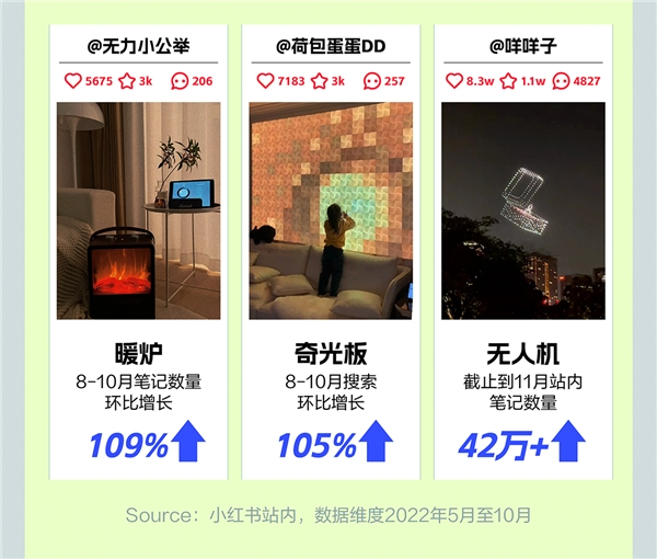 既要有全能派,也得有专精选手,针对具体场景的家电成为热门。「暖炉」环比增长109%、「奇光板」环比增长105%,这些热门好物的共同点都是在将居家的具体场景不断丰富,幸福感拉满;无人机以42w+笔记成为场景顶流,求婚、告白的霸总玩法谁能拒绝。