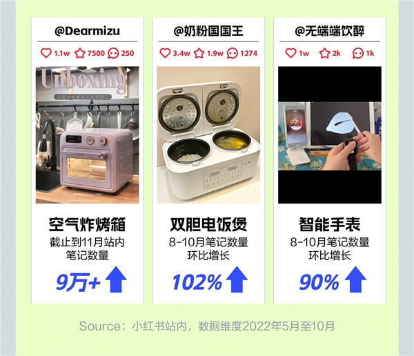 在四大品类中,体重秤、榨汁机、空调、微波炉、洗地机、空气炸锅等都是2022年备受小红书用户喜爱的热门单品。