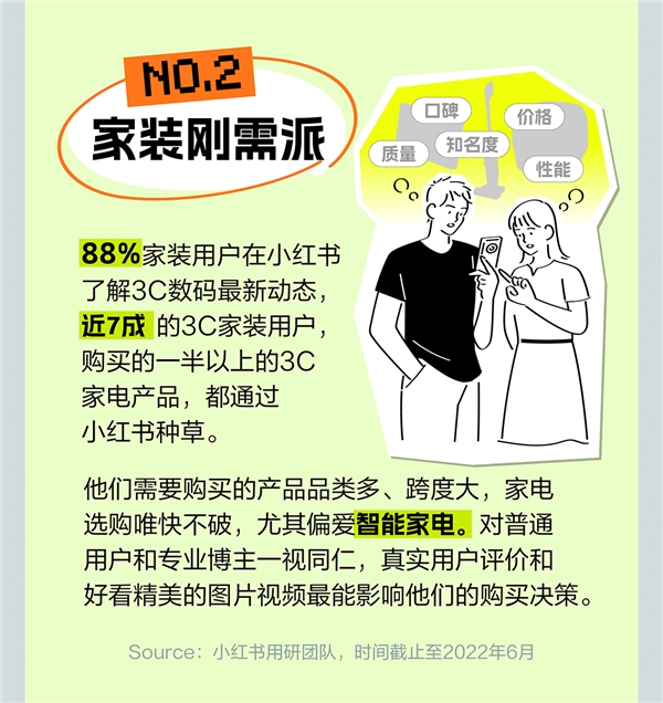 88%的家装用户通过小红书快速完成家电清单的购买,这个阶段的人群购买产品品类多、跨度大、预算充足,但都偏爱「智能家电」品类,爱看真实用户评价吐槽,多快好省买完整个家。