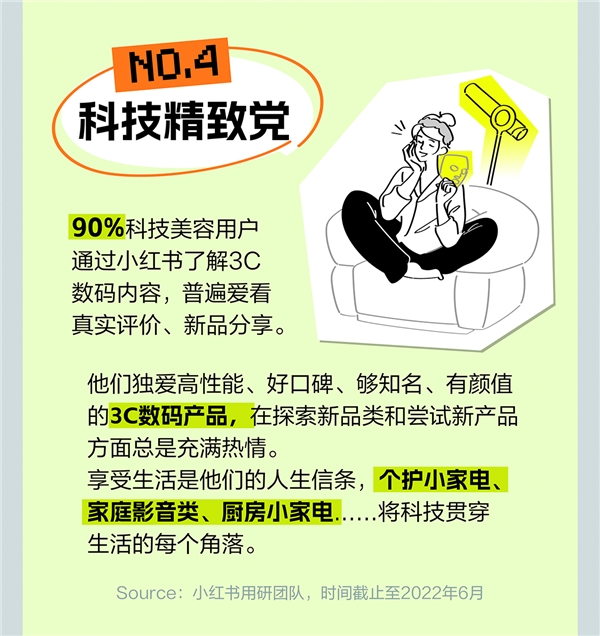 90%科技美容用户通过小红书了解3C数码内容,个护小家电、家庭影音类、厨房小家电都是他们爱看的类型,高性能、好口碑、够知名、有颜值,才能真正打动他们。