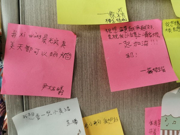 晏娟在文具店里设置了一面心愿墙,学生们可以用便利贴写上自己的小心愿。"希望阿姨的小店生意越来越好"、"希望晨光文具越来越好,阿姨越来越年轻越来越漂亮"......看到孩子们用稚嫩的笔迹写满的真诚祝福,晏娟经常感动得要掉眼泪,"这本应该是他们对自己的许愿,但他们却希望我越来越好。"