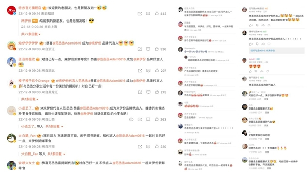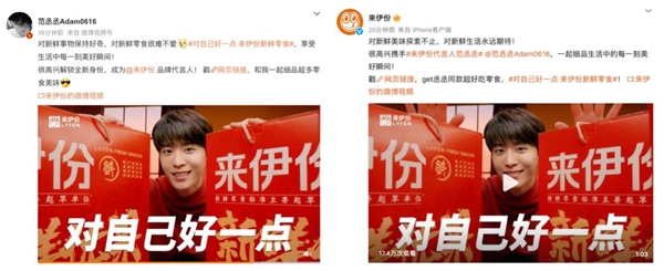 12月9日的早上9点,范丞丞的官方微博率先官宣,评论区瞬间一片欢腾,丞星和来伊份粉丝纷纷献上祝福。来伊份的官方回应接踵而至,并在包含微博、视频号、小红书、抖音、B站、微信公众号的全平台自媒体阵地同时放出来伊份X范丞丞共同演绎的新鲜态度大片。浓浓的“橙心丞意”驱散了冰冷的寒气,满眼都是明亮的橙色和喜气的红色,是青春帅气的新鲜味道。