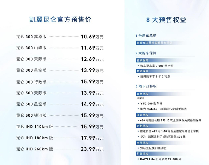 据了解,此次预售不仅给市场带来了很大惊喜,还一举打破了前段时间网上流出的昆仑预售价格谣言。预售权益显示,昆仑预售期间下订的用户,购车时不仅能拥有整车终身质保服务,还可享最高3000元置换补贴,按揭购车2年免息保障,更有5大超值预订权益等待解锁。为打消预订用户顾虑,凯翼汽车还做出承诺,今年年底前下订用户,因交付周期延长导致无法享受国家购置税减半政策的,增加部分由凯翼汽车承担。可以说,昆仑的预售权益对用户的照顾是方方面面,从售价到补贴,从用车到售后等多个维度,直接将用户的期待值拉满!