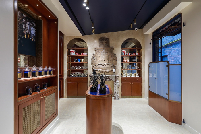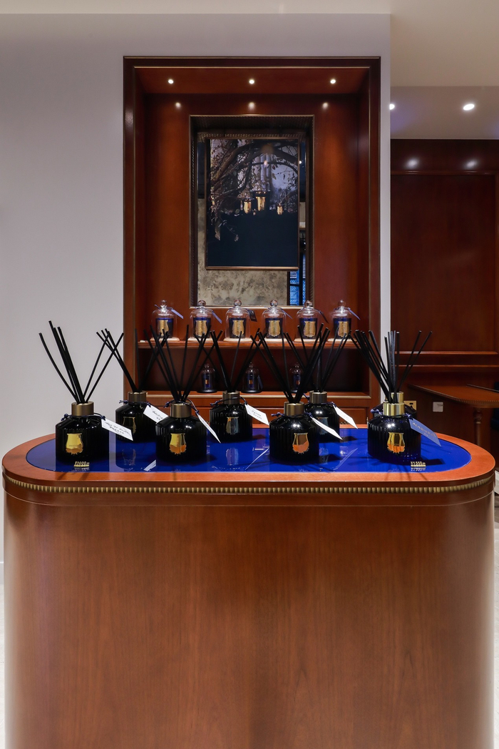 内部装潢的设计灵感参考18世纪法国豪宅和府邸的格调,延续品牌巴黎门店的风格,展现Trudon所珍视的品牌历史。门店面积36平方米,石灰华地板上点缀着同色调的八角形和凸圆形宝石,胡桃木作上装点着黄铜元素,包括各种框缘、踢脚线和镶边,还有一些复古镜子,仿佛照进旧时光。中央装饰是一个18世纪风格的壁炉,采用浅灰色大理石,带有深灰色纹路,上面放着皇家制造的品牌徽章复刻品。