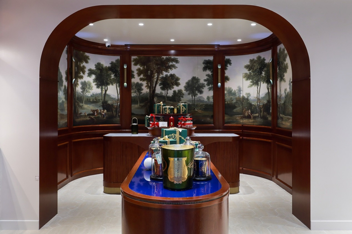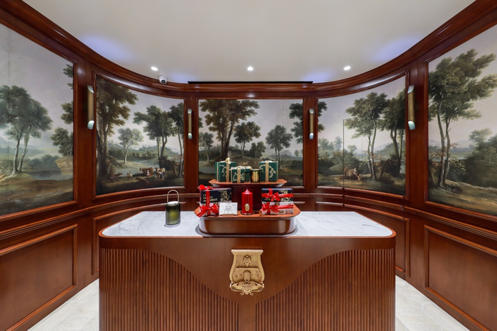 收银区是一个巨大的圆弧形凹室,中央摆放一张胡桃木柜台,饰以优雅的白色大理石桌面,并装点在法国模制并手工制作的Trudon品牌徽章。柜台周围,五块墙纸壁板组成一幅壁画:复刻自让·巴普蒂斯特·乌德里(1686-1755)的作品《五感:视觉》。这副来自18世纪的自然景色装饰描绘出郁郁葱葱的田园风光:对于五重感官都是美的享受,每块壁板还装饰定制的细木作和黄铜镶饰。 旨在致敬法国古典主义之美。
