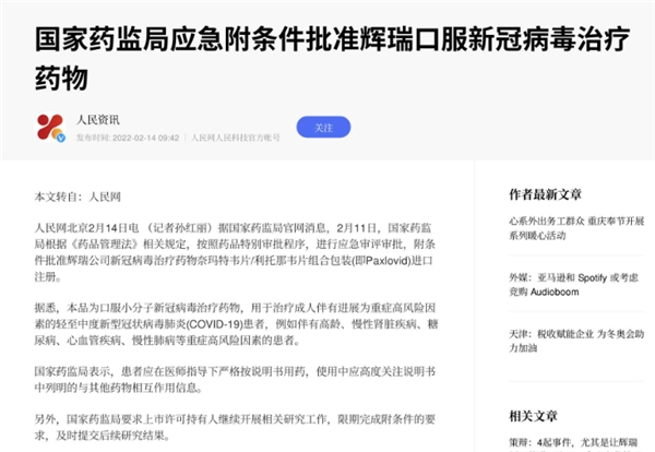 2022年2月14日国家药监局也批准了Paxlovid在国内的使用。