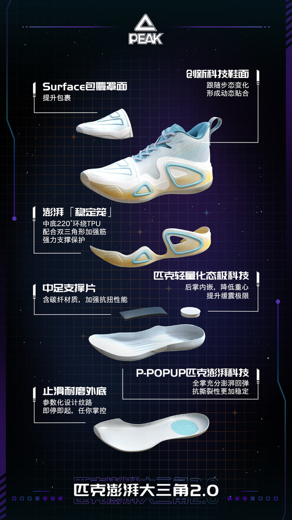 澎湃大三角2.0作为匹克定位全能的专业篮球鞋,对于场上各位置的功能需求的满足是设计与开发最重点关照的指标,因此在鞋头外侧环绕到内侧的220度中底TPU包边设计,并在外侧配合双三角形加强筋,组成了澎湃“稳定笼”,极大地加强了运动中的稳定性,并且提供中足支撑,配合“稳定笼”全方位加强鞋身刚性;鞋底采用多维度三角排列纹理,保证各个方向的抓地性能,同时提升耐磨性。