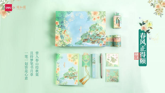 从2018年、2019年的“前程似锦”、“春风正得颐”,再到2020年、2021年的“日月澄晖”、“诸事得颐”。通过得力各式文具产品,皇家园林的四季朝晖走下古籍画卷,走进了学习与工作的日常场景。