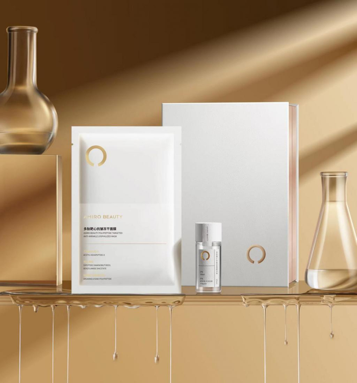 秉承科技护肤理念,AMIRO 觅光全新研发的多肽靶心抗皱冻干面膜,以 " 干湿分离 " 的形式区别于传统面膜形态在礼盒中升级亮相。