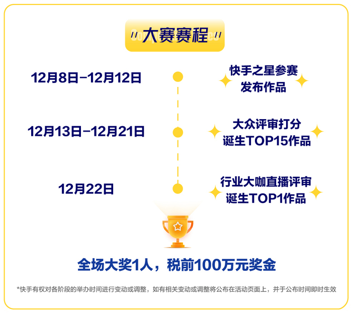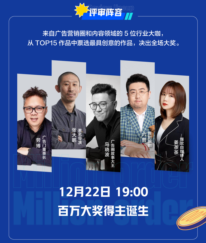 12月9日,快手之星“百万商单创意大赛”首发。以《一个在新年喝山楂树下的理由》为题,快手携手广告门、品牌主山楂树下共同打造,邀请快手之星创作者脑洞大开,通过大众评审和专业评审双重评定,寻找快手最有创意的爆款制造机,全方位展现创作者的创作能力和爆款能力,最终获胜的1名全场爆款王将独揽100万大奖。作品发布后,在大众评审的反馈下,沉淀出第一批优质作品,12月22日晚7点,劳博、马晓波、六兽、姜茶茶、张大鹏五位顶尖创意行业大咖聚在一起,对参赛作品进行鞭辟入里的剖析和解读,在共同见证下决出百万大奖获得者。