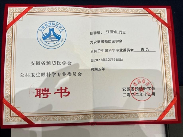 经过评选,合肥普瑞眼科医院儿童眼病与视光专科汪丽娟主任荣选为安徽省预防医学会公共卫生眼科学专业委员会委员!