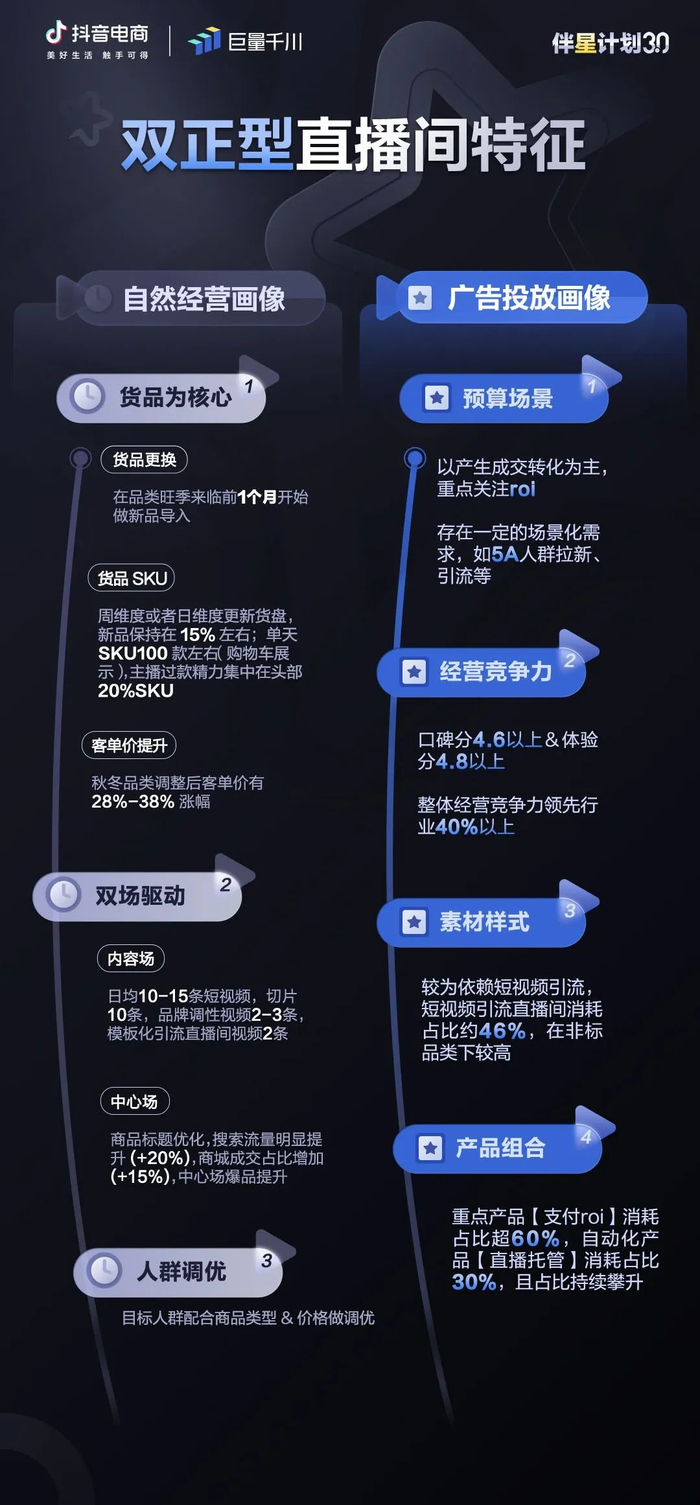 双正型直播间指的是“付费推广”与“自然经营”均盈利的理想型直播间,这类直播间是付费流量与自然流量实现协同的“优等生”,在经营与投放方面呈现出以下特征: