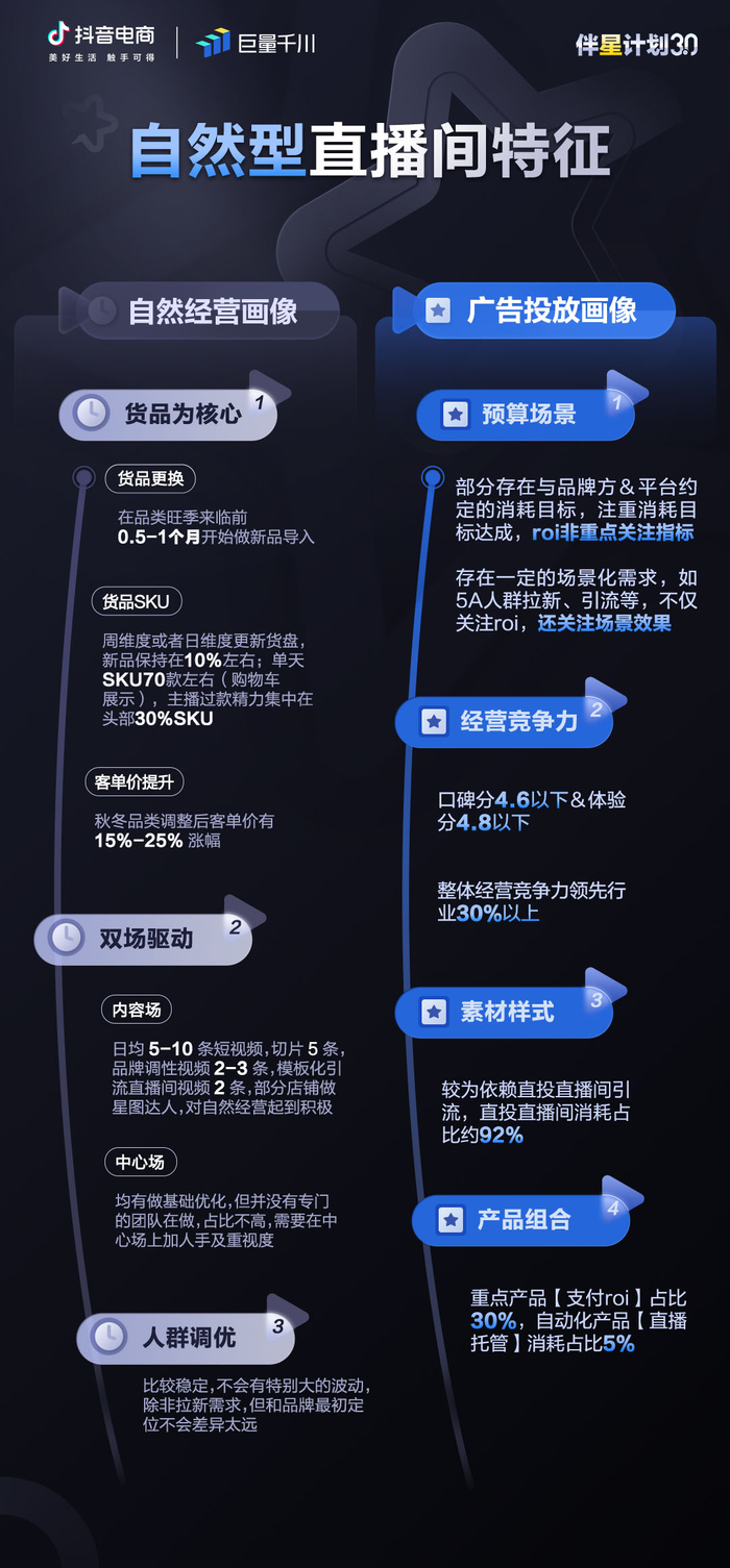 自然型直播间,指的是“自然经营”盈利,但需要优化“付费推广”的服务商直播间。这一部分服务商拥有较好的自然流量打底,通过巨量千川投放可以达到事半功倍的效果。