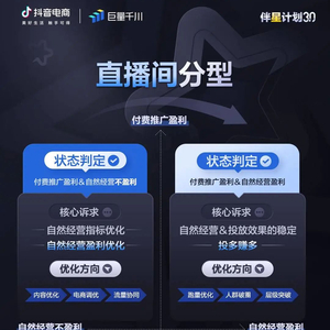 为帮助抖音电商服务商提高投放能力,巨量千川推出「伴星计划3.0」,计划从冷启动、付费价值优化、投多赚多、大促这四大场景入手,通过直播间针对性扶持政策帮助服务商直播生意节节攀升。本期内容主要针对“投多赚多”场景,从服务商盈利分型入手,协助优化直播间自然经营&投放效果,助力服务商与商家实现“越投越赚钱”的新突破。