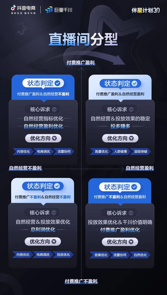 为了帮助服务商判断自身是否处于投多赚多的阶段,在伴星计划3.0中,我们前置明确了直播间的盈利分型及细分画像,使服务商可以从直播间的薄弱处着手,高效解决问题。