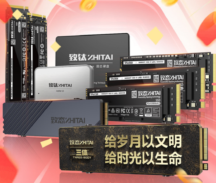 除了新品预售,致态家族全系产品也是福利满满。从致态TiPlus7100 1TB到TiPlus5000,性能旗舰TiPro7000,以及具备独特IP联名的TiPro7000三体联名版固态硬盘产品,都将以劲爆的福利价格,回馈广大“致友”。