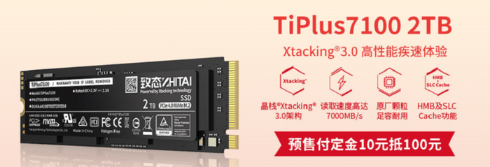 抢新品 致态TiPlus7100 2TB预售10元定金直抵100元
