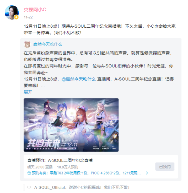 此次央视网小C与A-SOUL嘉然进行采访联动,一定意义上推动着中国虚拟人产业通过数字技术的创造力。未来双方还会有哪些合作?令人充满期待。