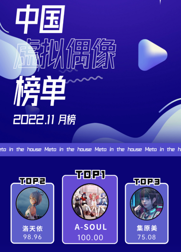 同样,在中国虚拟偶像排行榜暨2022年11月榜单中, A-SOUL排名TOP1。