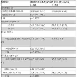 在DESTINY-Breast03试验进一步随访中,德曲妥珠单抗也持续在无进展生存期(PFS)上显示出具有临床意义的改善,与T-DM1相比,中位PFS改善了22个月,再次证实了之前中期分析结果的统计学意义。新的探索性分析没有就统计学意义进行考察,数据也没有显示治疗组之间的差异。在本次事后分析中,经盲法独立中心评审委员会(BICR)评估,德曲妥珠单抗治疗组患者的中位PFS为28.8个月,而T-DM1组为6.8个月。德曲妥珠单抗组确认的客观反应率(ORR)为78.5%,其中21.1%的患者表现为完全缓解(CR),而T-DM1组的ORR为35.0%,其中9.5%的患者达到CR。德曲妥珠单抗组的中位持续缓解时间(DoR)为36.6个月,T-DM1组为23.8个月。