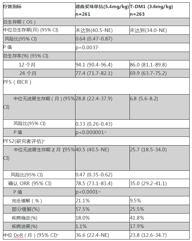 DESTINY-Breast02试验的主要终点是基于BICR的PFS,关键次要终点是OS。其他次要终点包括基于BICR和研究者评估的ORR、基于BICR的DoR、基于研究者评估的PFS和安全性。