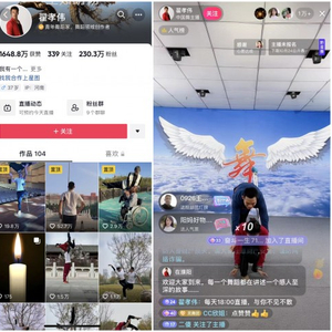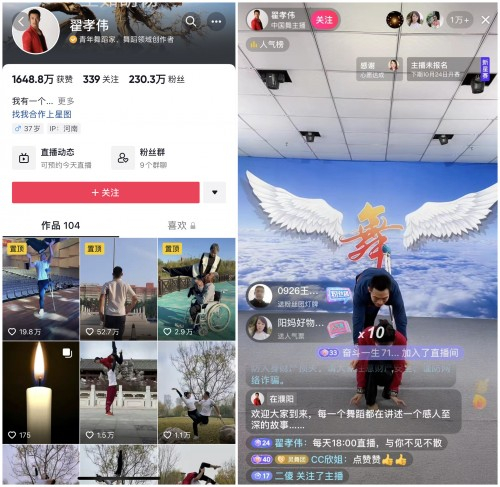 回归家庭后的翟孝伟遇到的最实际的问题是,作为一个舞蹈演员,没有演出就没有收入。2020年春节,抱着试一试的心态,翟孝伟随手在抖音上发了几条自己练舞的视频,“没想到流量一下上去了”,翟孝伟再次感受到了舞台的召唤。如今,翟孝伟已经在抖音发布了上百条舞蹈作品,收获了超200万粉丝、获赞超千万。