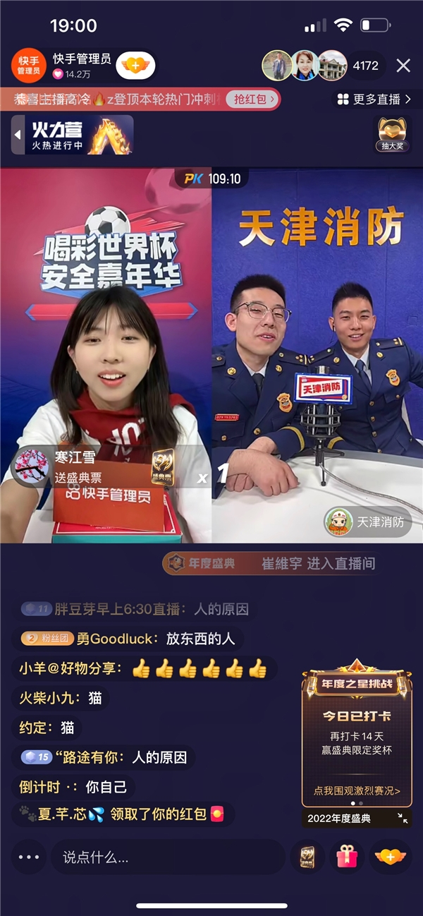 这是“快手管理员”和“天津消防”pk连麦时进行快板说唱的一幕。